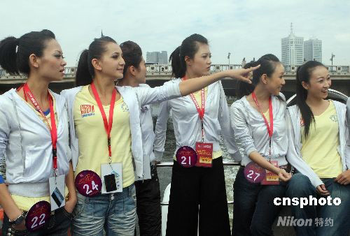 9月27日,正在天津參加“2008東麗湖世界最佳模特大賽(best model of the world)中國區總決賽”的50名男女選手,乘游船游覽天津市區新貌,海河風光。中新社發 錢興強 攝