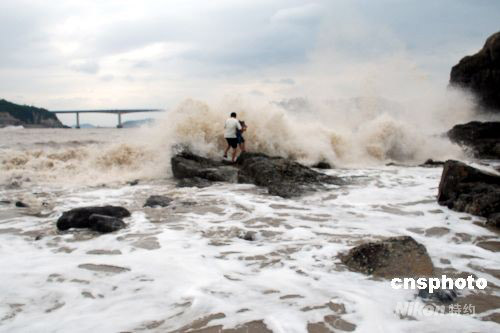 9月28日,受超強臺風“薔薇”影響,浙江溫州市洞頭島海域已是波濤洶涌,海礁上掀起的巨浪高達10多米。下午2時許,一對外地父女在海邊游玩時不慎被突漲的潮水困在礁石上,隨時可能被海浪吞噬。正在海邊巡邏的洞頭邊防大隊官兵發現險情后,迅速展開緊急營救,成功將父女從海浪中安全救上岸。中新社發 吳水斌 攝