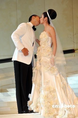 圖為陳慧琳與夫婿劉建浩在婚禮上情深一吻。中新社發 鄧慶樂 攝