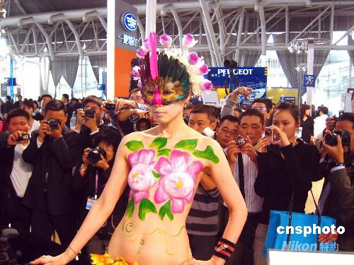 10月8日,在2008南京國際車展上,汽車廠商在展臺前展示的人體彩繪汽車模特吸引著眾多參觀者的眼球。中新社發(fā) 谷昌旺 攝