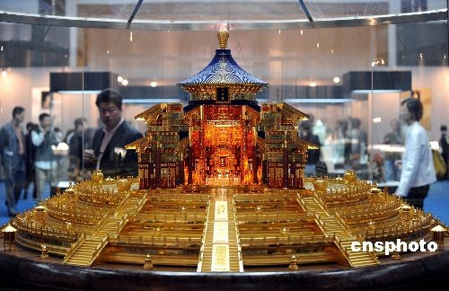 十月十四日,鑲有約20萬粒寶石的“天壇祈年殿”工藝品引人注目。這件作品高1.38米,重2.5噸,以金銀、寶石等材料制成。當日,中國傳統工藝美術精品大展在北京民族文化宮舉行,該展集中展現了改革開放以來中國工藝美術三十年發展成就。中新社發 廖攀 攝