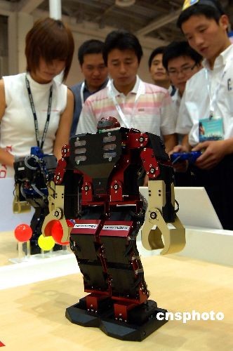 第七屆中國蘇州電子信息博覽會于10月16日在蘇州工業園區國際博覽中心隆重舉行。該展會今年參展企業首次突破六百家,共計一千六百五十個展位,預計將有十五萬人次進場參觀。圖為中國一家廠商展示玩耍彩球的機器人,由觀眾控制機器人進行投放球比賽。中新社發 鄒憲 攝