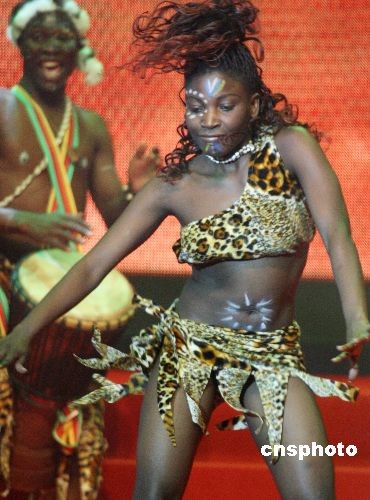 10月16日晚,2008北京大紅門國際服裝節開幕晚會在北京舉行,晚會匯聚中外模特,展示歐、美、亞時裝新款作品,來自加拿大THE KILL KENNYS樂隊、非洲AFRIACANRYTHM樂團以及中國內地歌手等參加演出。圖為非洲歌舞助興北京大紅門國際服裝節。中新社發 錢興強 攝