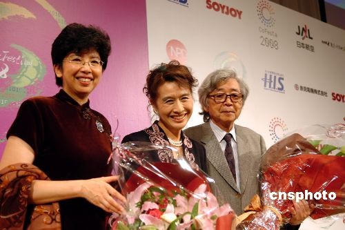 圖為在晚上舉行的開幕酒會上,中國廣電總局副局長趙實向日本著名導演山田洋次(右)、著名演員栗原小卷(中)頒發(fā)“中日文化交流促進獎”,以感謝他們多年來為中日文化交流所作出的巨大貢獻。中新社發(fā) 朱沿華 攝