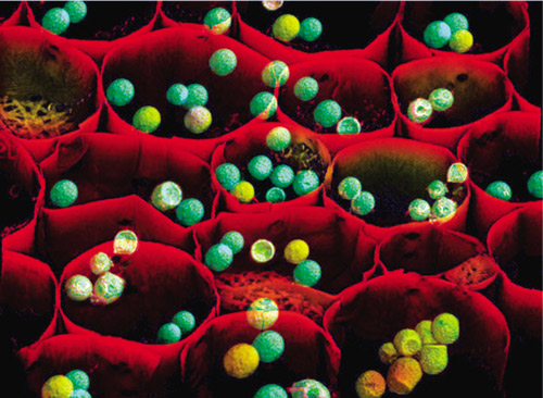 鈴蘭,阿爾伯特·圖森攝,放大1300倍。拍攝地點:美國阿拉巴馬州伯明翰。細胞學家圖森已從事顯微攝影25年。圖中,紅色的是細胞壁,綠色和黃色的是淀粉顆粒。所用技術:共焦。
