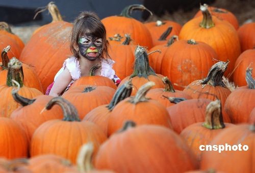 十月十九日,一位裝扮成鬼怪的美國女孩在南瓜地里嬉戲!叭f圣節”將至,許多洛杉磯市民來到遠近聞名的貝弗利山莊“骨頭先生南瓜田”,選購自己中意的南瓜,準備自制南瓜燈,為即將到來的萬圣節營造節日氣氛。中新社發 張煒 攝
