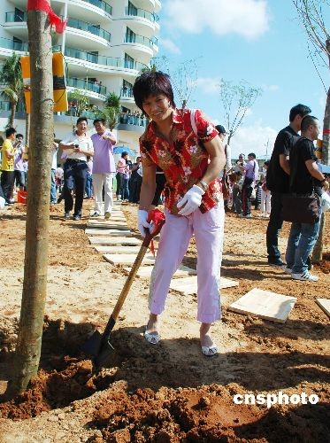 圖為北京奧運(yùn)會(huì)女子柔道52公斤級(jí)冠軍冼東妹在種樹。中新社發(fā) 尹海明 攝