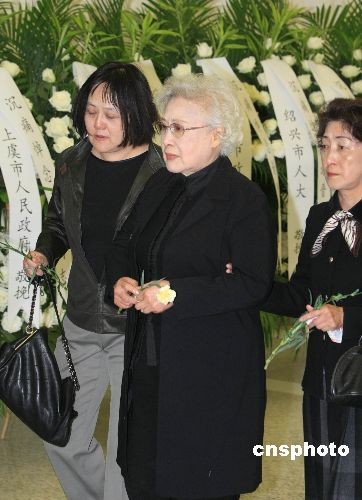 曾在謝晉導演拍攝的《女籃5號》里出演女主角、現已86歲高齡的老藝術家秦怡(中)也親自到場,為老朋友送行。中新社發 湯彥俊 攝