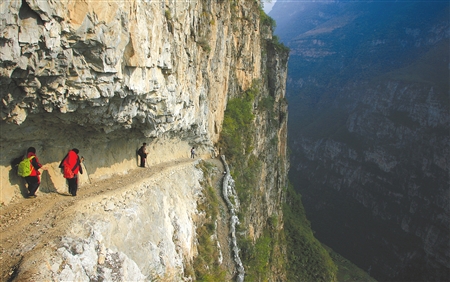 10月14日上午10時(shí),湖北志愿者隊(duì)伍來(lái)到古路村山腳。如果不是偶爾發(fā)現(xiàn)裝載行李的騾馬在絕壁間行走,無(wú)法想象幾近90度的陡壁上竟有一條千回百轉(zhuǎn)的“Z”字形“騾馬道”。這條山道沿途七拐八彎,最窄的地方只有40厘米寬。行走在這樣的高空回廊上,讓人頭昏目眩。