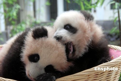 5.12汶川大地震發生時,大熊貓“幗幗”已經懷孕110余天,5月24日“幗幗”被安全轉移至碧峰峽基地,7月6日“幗幗”順利產下一對龍鳳胎。這對龍鳳胎大熊貓成為2008年出生的全球首對大熊貓雙胞胎。為給這對不平凡的熊貓寶寶取一個有意義的名字,中國保護大熊貓研究中心聯合網絡媒體一起發起 “2008全球首對大熊貓雙胞胎征名活動”。10月下旬,中國保護大熊貓研究中心雅安碧峰峽基地歌聲飛揚——2008年全球首對大熊貓雙胞胎百日慶典活動隆重舉行;同時大熊貓研究中心向全球公布了網上投票選出的 “平平”“安安”兩個熊貓幼仔乳名。中新社發 羅小韻 攝