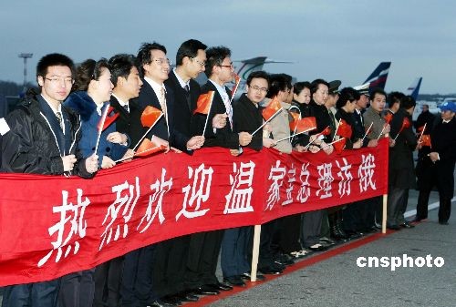 溫家寶在機場受到俄副外長博羅達(dá)夫金等俄方官員的熱情迎接并出席了歡迎儀式。