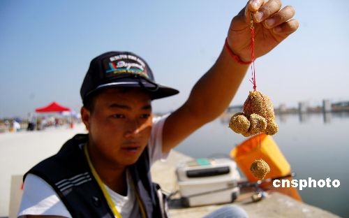 十月二十八日,在福建南安八月湖舉行的第六屆全國農運會釣魚比賽正有條不紊進行著。圖為拋桿釣比賽選手做好的魚食尤為有趣。中新社發 傅丹丹 攝