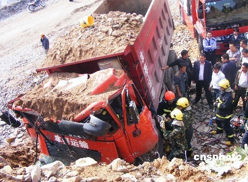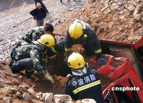 10月27日9時,浙江省寧波慈城鎮黃山村上演驚人一幕:一輛滿載石塊車牌為皖N60589的大卡車因為制動失靈,在近50度的山路陡坡上演飄移,撞向山路上的懸崖峭壁,導致山體局部塌方,整個車身被滾落的山石掩埋。消防部門接警后第一時間趕往現場,成功將被困司機救出。中新社發 何蔣勇 攝