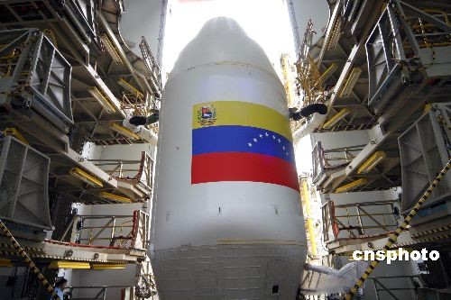 發射前位于運載火箭頂部的衛星整流罩外印有委內瑞拉國旗。中新社發 尹濤 攝