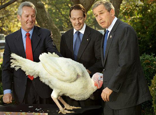 2001年感恩節期間,布什總統赦免一只名叫“自由”的火雞,這只火雞一下子撞向布什肚子。作者:旺仔