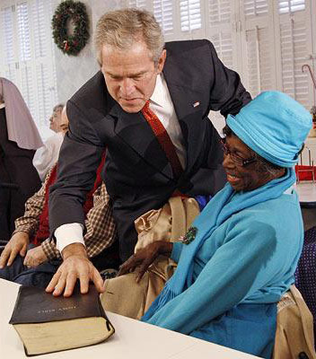 布什在參觀華盛頓的老年人慈善機構(gòu)“窮人姐妹”時,好奇地看一位老年人的《圣經(jīng)》。作者:旺仔