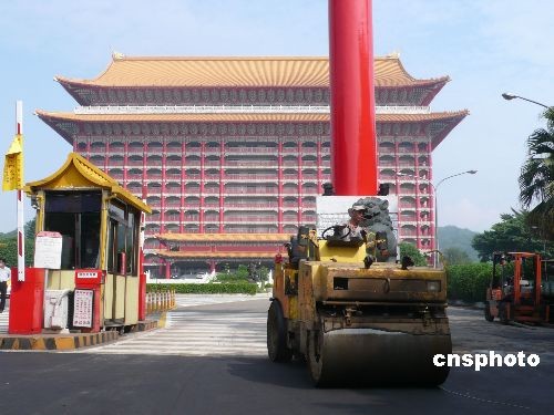 大陸海協會會長陳云林訪臺將下榻在有50多年歷史的臺北市圓山大飯店。為了迎接貴客的到來,有關工作人員正在平整飯店門前的路面。中新社發 于晶波 攝