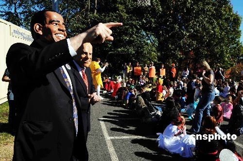 當?shù)貢r間十月三十一日下午二點,美國弗吉尼亞埃西蘭小學(xué)舉行一年一度的全校萬圣節(jié)假面游行,當校長米蘭達先生等扮演的總統(tǒng)參選人“奧巴馬”“麥凱恩”出現(xiàn)在孩子們面前,孩子們發(fā)出陣陣的歡呼聲。中新社發(fā) 邱江波 攝