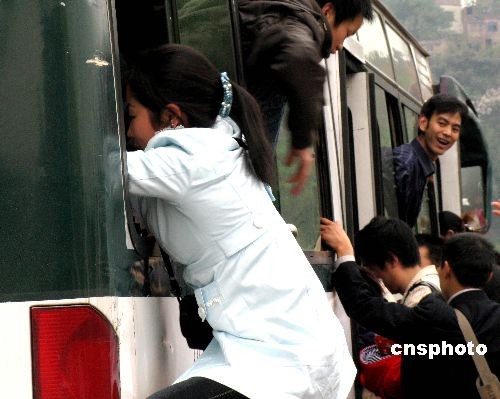 重慶主城區(qū)出租車罷運(yùn)事件11月4日上午仍在持續(xù),但從重慶市出租汽車協(xié)會了解到,截止4日下午16點(diǎn)30分,重慶主城區(qū)共有4000多輛出租車上路營運(yùn),占全市主城區(qū)出租車數(shù)量的一半,持續(xù)到4日上午的罷運(yùn)事件出現(xiàn)良好轉(zhuǎn)機(jī),但仍嚴(yán)重影響市民出行,在南坪區(qū)出現(xiàn)了部分市民為了趕車回家攀爬公交車的情景。中新社發(fā) 許康平 攝