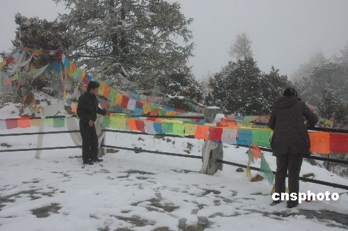 深秋季節,四川甘孜藏族自治州高海拔地區普降大雪。圖為被譽為“中國最后的香格里拉”——四川稻城縣內,當地藏民正在雪地中掛龍達祈禱吉祥。中新社發 肖龍聯 攝