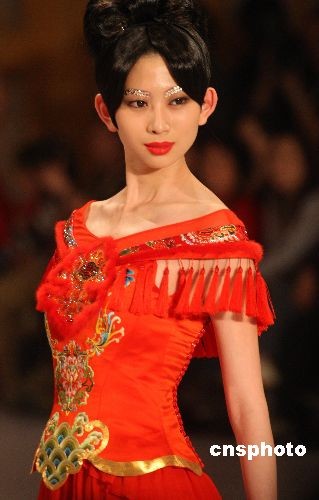 11月5日晚,北京舉行的中國國際時裝周(2009春夏系列發(fā)布),上演了一場華服大典。“國色天香 華服大典”以緙絲傳承歷史,以牡丹展現(xiàn)盛世繁華,續(xù)寫中國奢侈品文明復(fù)興的傳奇。圖為模特展示2009華服大典作品。中新社發(fā) 錢興強 攝