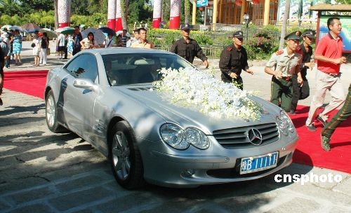 11月6日,2008北京奧運(yùn)會(huì)體操“全能王”在海南三亞著名的天涯海角景區(qū)的沙灘上舉行盛大浪漫的婚禮,與新娘楊云經(jīng)過(guò)8年的愛(ài)情長(zhǎng)跑,終于走進(jìn)婚姻的殿堂。圖為楊威迎娶楊云的豪華婚車(chē)。中新社發(fā) 尹海明 攝