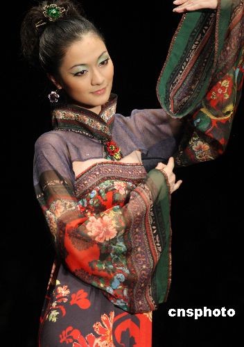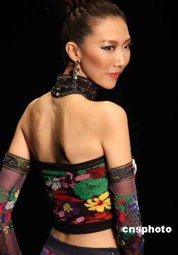 11月9日晚,在北京舉行的中國國際時裝周2009春夏系列發(fā)布上,推出鄧皓“似水女人”時裝作品。服裝設(shè)計上充分利用針織與梭織面料的特性進行組合搭配,同時以大量的刺繡、鑲花、縷空、輯線在服飾上的運用,體現(xiàn)出女性柔情似水,更表達出一種自信的人文關(guān)懷。中新社發(fā) 錢興強 攝