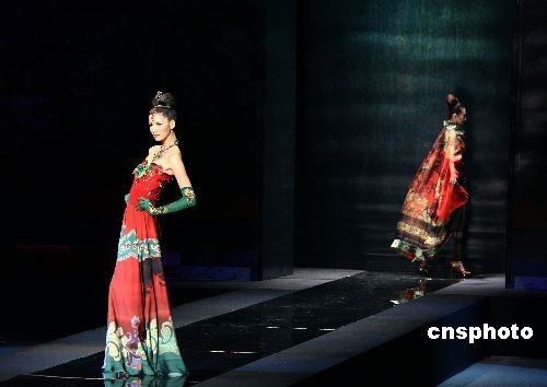 2008年11月9日,中國國際時裝周(2009春夏系列)在北京舉行鄧皓2009春夏時裝發布,莫萬丹、劉多兩大名模傾情演繹,臺上相互爭艷。中新社發 魯谷 攝