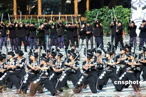 11月9日,貴州黔東南雷山縣幾千苗族同胞進行采排,為2008年11月10日舉行的雷山苗年開幕式作準備,采排現(xiàn)場盛況空前,許多游客前往圍觀。貴州黔東南苗族侗族自治州著名旅游點雷山縣西江千戶苗寨有“中國天然苗族博物館”、“中國苗族文化中心”、“中國著名景觀村落”之譽。中新社發(fā) 吳興權(quán) 攝