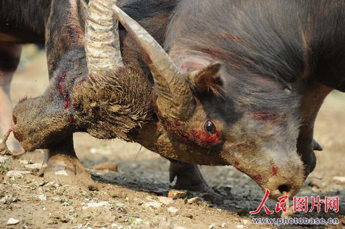 11月11日,貴州雷山縣苗族同胞迎來了一年一度的苗年節,在雷山縣城河灘上,苗族同胞舉行斗牛斗豬比賽歡度苗年節。圖為兩頭水牛在比賽中。(吳東俊)