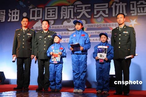 11月14日,“長城潤滑油·中國航天員體驗營活動”在北京航天城拉開帷幕。體驗營是由中國石化長城潤滑油與《航天員》雜志社共同主辦的大型體驗式航天科普公益活動,從全國各地數千名報名者中遴選出來的數十位幸運營員,14日至16日將在北京航天城度過為期3天的航天體驗之旅。中國航天員楊利偉、費俊龍、聶海勝在開營儀式上與小營員互贈禮物。中新社發 盛佳鵬 攝