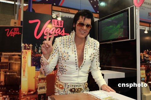 11月20日,美國拉斯維加斯“貓王”親臨上海“二00八中國國際旅游交易會(huì)”,并站臺推介美國旅游。中新社發(fā) 潘索菲 攝