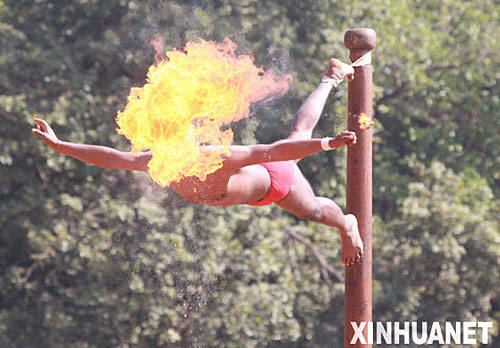 印方參訓(xùn)分隊進行軟木桿操噴火演示。