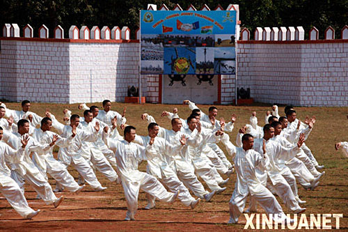 12月6日,“攜手-2008”中印陸軍反恐聯(lián)合訓(xùn)練開訓(xùn)。開訓(xùn)儀式結(jié)束后,中印雙方進行了武器裝備展示和訓(xùn)練課目演示。中方參訓(xùn)部隊進行了太極拳、捕俘技術(shù)、反恐應(yīng)用射擊動作的演示,印方參訓(xùn)分隊演示了木桿操、印度傳統(tǒng)武術(shù)等課目。參訓(xùn)雙方官兵精神振奮,配合默契。