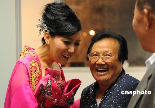 12月9日,和諧之聲——譚晶深圳獨(dú)唱音樂(lè)會(huì)在深圳音樂(lè)廳舉行。圖為鄧小平之妹鄧先群到后臺(tái)祝賀譚晶演出成功。中新社發(fā) 廖攀 攝