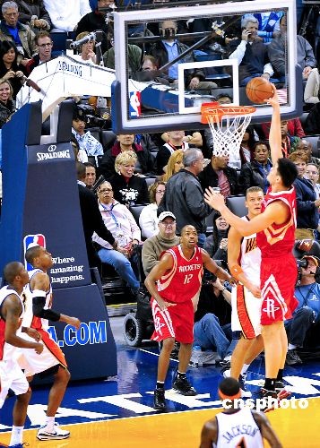 當(dāng)?shù)貢r(shí)間12月12日晚,休斯頓火箭隊(duì)與金州勇士隊(duì)在加州奧克蘭主場甲骨文體育館進(jìn)行一場比賽。姚明雖患感冒但仍拿下19分14個(gè)籃板,阿泰斯特因?yàn)橛夷_踝有傷休戰(zhàn),1號(hào)球星麥格雷迪復(fù)出首發(fā)并表現(xiàn)搶眼,最終火箭以119-108輕松戰(zhàn)勝對(duì)手取得兩連勝,時(shí)隔一周后再次大勝勇士。目前火箭總戰(zhàn)績達(dá)到15勝8負(fù),勇士7勝16負(fù)。圖為姚明上籃。中新社發(fā) 陳鋼 攝