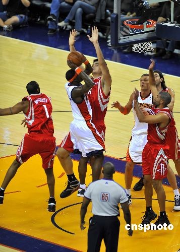 圖:姚明奮力阻攔金州勇士隊的進攻
