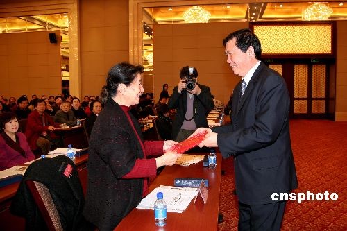 中國文聯黨組副書記、副主席李牧給新當選的中國美協顧問常沙娜頒發聘書。中新社發 王保勝 攝