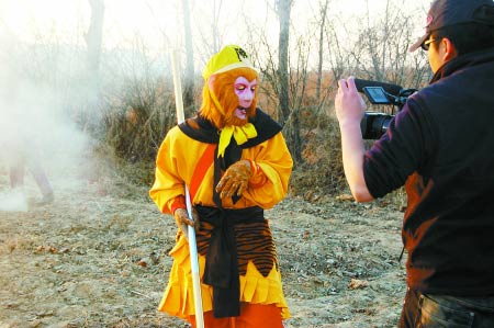 沙僧的扮演者洪海也很有意思。采訪過程中,不停地給大家倒茶,大家都笑沙僧真的很淳樸。為了演好沙僧,31歲的洪海從景區租來馬練習牽馬,不料還被馬踢傷了!翱赡荞R也被我們這些打扮怪異的人‘驚’了吧!