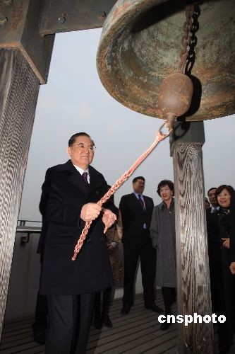 12月20日,中國國民黨榮譽主席連戰在上海世博局訪問,并激情地撞“古鐘”,祝福上海。中新社發 潘索菲 攝