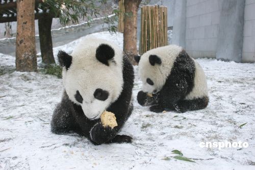 2006年1月,臥龍降雪團團圓圓玩滾雪球。中新社發 衡毅 攝