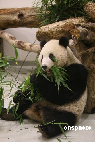 大陸贈臺一對大熊貓“團團”和“圓圓”12月23日晚間抵達臺北,住進臺北市立動物園的新光特展館。圖為雄性大熊貓“團團”抵達新家半個小時后抱著臺灣箭竹大快朵頤。這是它在新家的第一頓飯。 中新社發(fā) 路梅 攝