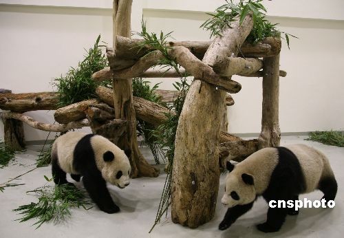 圖為經(jīng)歷了一天旅途勞頓的“團團”和“圓圓”在新房間里團聚。 中新社發(fā) 路梅 攝