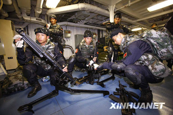 12月25日,海軍特戰隊員在軍艦艙室里擦拭武器。
