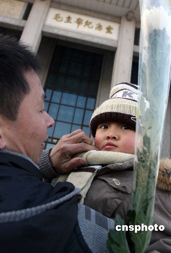 12月26日毛澤東115周年誕辰日清晨,一名四川地震災區(qū)的三歲男童與父親到位于北京天安門廣場的“毛主席紀念堂”敬獻白菊鮮花,深切懷念偉大領(lǐng)袖毛主席。