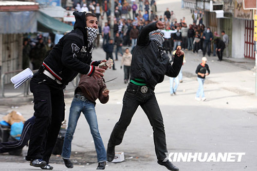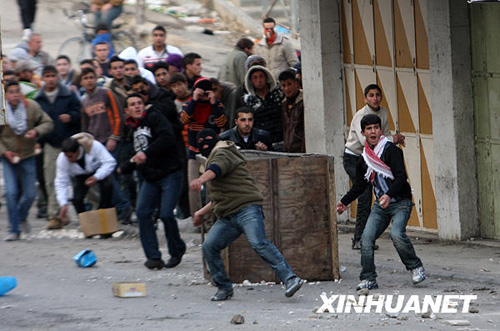 12月27日,在約旦河西岸城鎮希伯倫,巴勒斯坦人向以色列士兵投擲石塊。當日,上百名巴勒斯坦人在希伯倫抗議以軍空襲加沙,并與以色列士兵發生沖突。新華社記者 殷博古 攝
