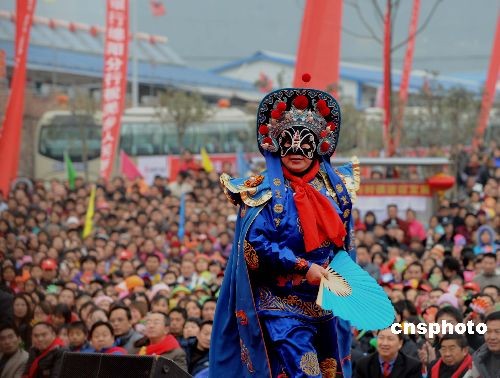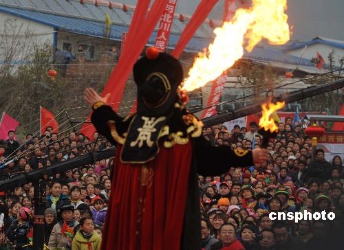 12月31日,川劇著名變臉演員在四川地震極重災區的擂鼓鎮板房區前,展示噴火技藝慰問北川縣上萬民眾干部,以迎元旦文藝表演告別難忘的2008年。中新社發 賈國榮 攝