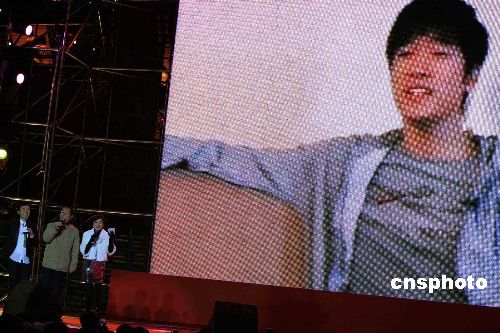 上海:2008年的最后一個夜晚,劉翔的父親劉學根(左中)親臨在上海黃浦江畔舉行的可口可樂“暢爽開心年,新春齊分享”新年倒計時晚會,并現場與遠在美國療傷的劉翔一起,通過視頻,共唱新年快樂歌。 中新社發 潘索菲 攝