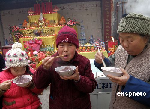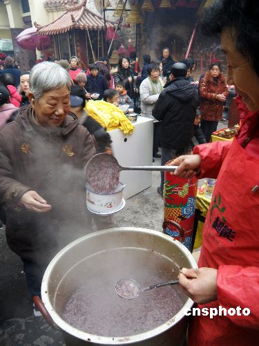 2009年1月3日,農歷臘月初八,是中國傳統的臘八節,湖北宜昌三峽古佛寺里準備了豐盛的臘八粥,眾多名市民在古佛寺里喜吃臘八粥。據悉,臘八粥又稱佛粥,與佛祖釋迦牟尼得道成佛有關。臘八粥在民間被視為吉祥食品,寓意一年之末的大豐收及來年風調雨順,吉祥如意。中新社發 劉君鳳 攝