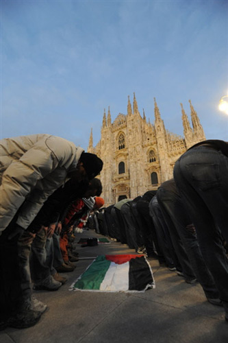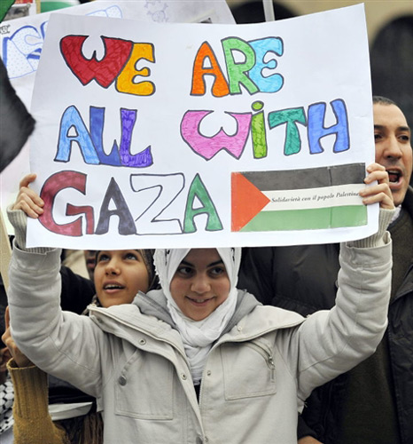 1月3日,在意大利米蘭,當地群眾舉行集會活動,對在加沙地區遭空襲的巴勒斯坦死難者進行祈禱,抗議以色列襲擊加沙。